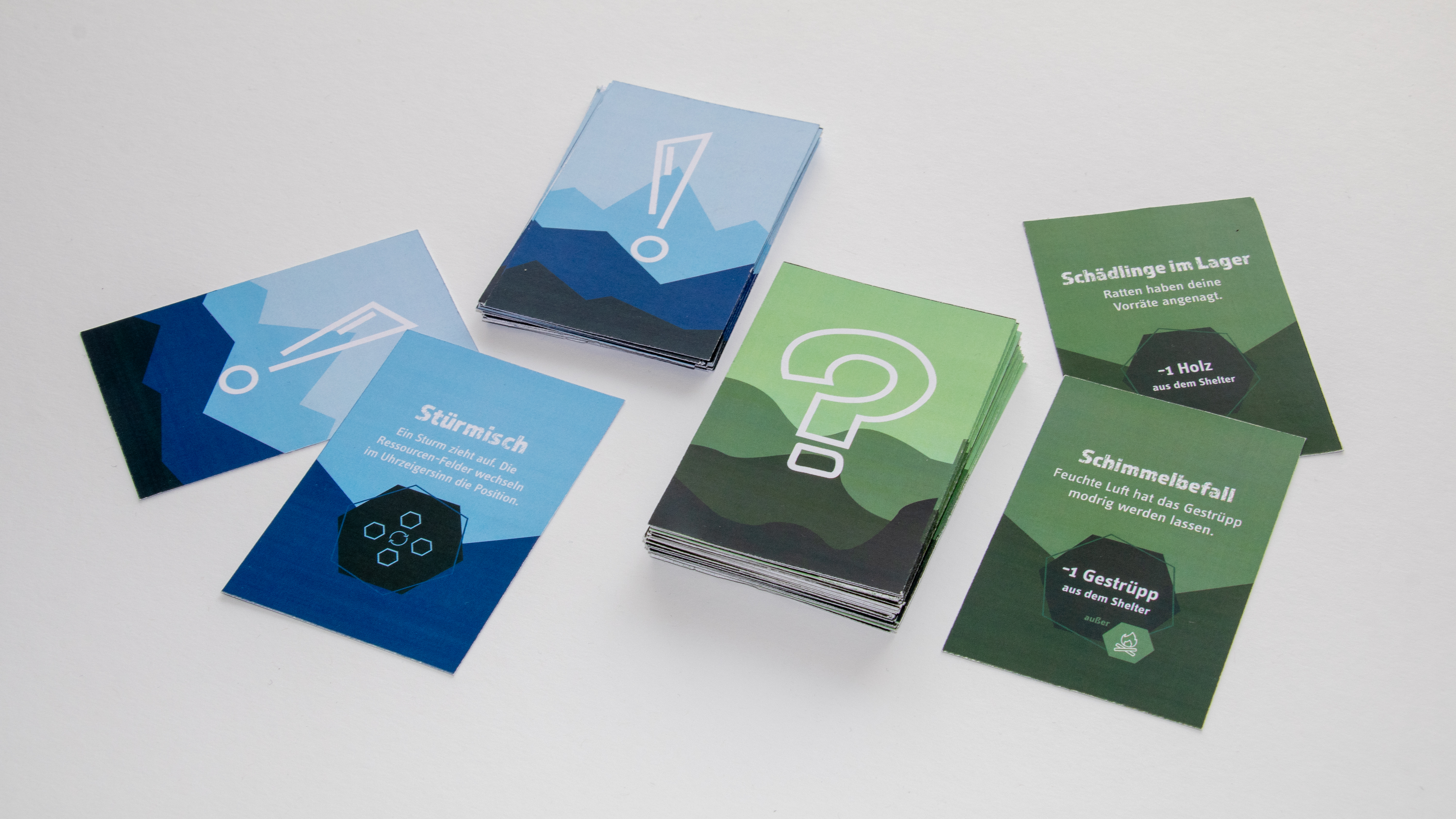 Es handelt sich um ein 2–4-Spieler-Brettspiel. Das Ziel ist es, in deiner Basis einen Shelter mit Hilfe der gesammelten Ressourcen zu bauen. Das Spiel endet, sobald ein Spieler seinen Shelter erfolgreich vervollständigt hat. Danach werden die Punkte gezählt, um den Gewinner und die Platzierung zu bestimmen. Auf dem Spielbrett sind vier Ressourcenfelder platziert, zu denen die Spieler*innen gelangen müssen, um ihren Shelter auszubauen oder hilfreiche Werkzeuge zu erlangen. Ein Spielzug besteht aus vier Schritten: Würfeln, Wegfeld ziehen und legen, Aktions- oder Ereigniskarte ziehen und die Spielfigur je nach Energielevel fortbewegen. Doch Achtung! Es kann zu vielen unerwarteten Ereignissen kommen. Hier muss man strategische Entscheidungen treffen und seine Züge clever planen. Deine Mitspieler*innen können zu Freunden, aber auch zu Feinden werden – sie können Wege verbauen oder dich ausrauben, wenn sie dir über den Weg laufen. Bist du für die Wildnis gemacht?